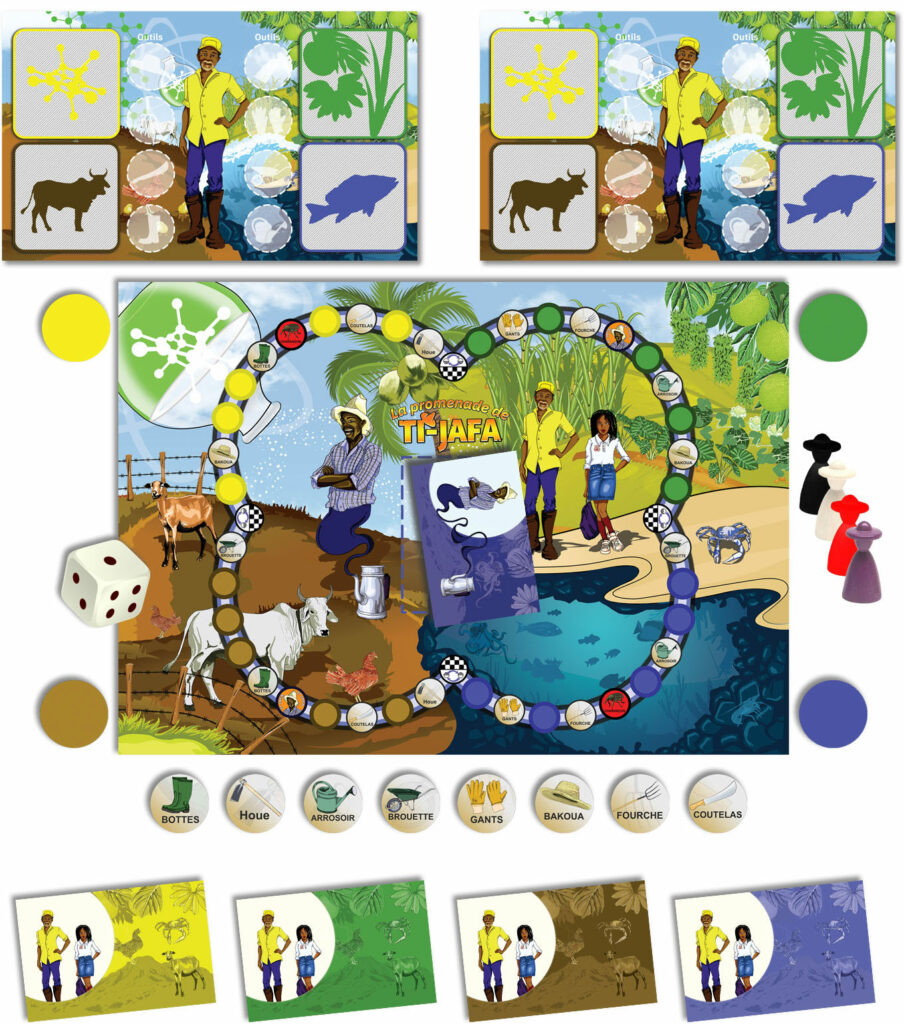 Le jeu « La promenade de Ti-JaFa » est un jeu de plateau avec une piste à suivre à travers 4 univers (Eau, Terre, Élevage, Sciences)